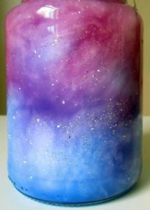 Para empezar llena 1/3 del tarro con agua, agrega unas gotas de colorante que más te guste y agita. Pon un poco de brillantina en tu frasco. Toma las bolas de algodón estirándolas un poco con las manos antes de introducirlas en el tarro. El siguiente paso consistirá en añadir un poco más de colorante de otro color, un poco de brillantina y más bolas de algodón. Si quieres puedes añadir hasta 3 colores que combinen.