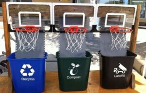 Un divertido modo de hacer que los niños reciclen es crear unas papeleras-canasta donde podrán seleccionar los elementos según los materiales de los que están compuestos. Unas redes sobre los cubos serán suficiente para que el reciclaje se convierta en un juego para ellos.