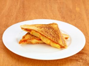 - Poner un poco de mantequilla en la sandwichera, colocar el sándwich cerrado durante 5 minutos, hasta que se dore. Repetir la misma operación para cada sándwich que se elabore.