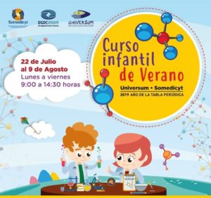 Talleres de ciencia, visitas a Universum y lugares de interés, actividades deportivas y recreativas. Costo al público en general $4,500.00. Mayores informes: Oficina de la Somedicyt, Casita de las Ciencias, planta baja. Atención de lunes a viernes de 10 a 15 y 16 a 18 horas, tel. 56227330 y 56654910, [email protected]. Página web: http://www.dgdc.unam.mx/actividades/e/55/curso-infantil-de-verano-2019