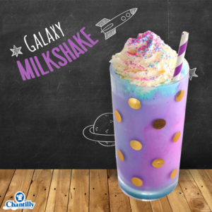Al derretirse los colores se irán integrando y se formará una mezcla que dará la recreación de la galaxia. Rellena el resto del vaso con Chanty Wip Sin Azúcar y decora la parte superior con trocitos de obleas.