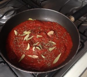 Lo pones en un sartén un poco de aceite de oliva ya que esté caliente viertes la salsa, el laurel y el comino, lo revuelves y cuando esté listo lo pones aparte.