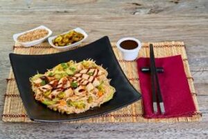 - Servir la ensalada de fideos, con el pollo rebanado, terminar con ajonjolí tostado y salsa negra adicional (opcional).