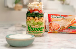 - Para armar el Yemina® Yar, crea capas en el frasco con los ingredientes en el siguiente orden: Codo Yemina® +Energía, los jitomates cherry, el pepino, la espinaca, la mandarina, el queso feta, las semillas de girasol y al final el aderezo.